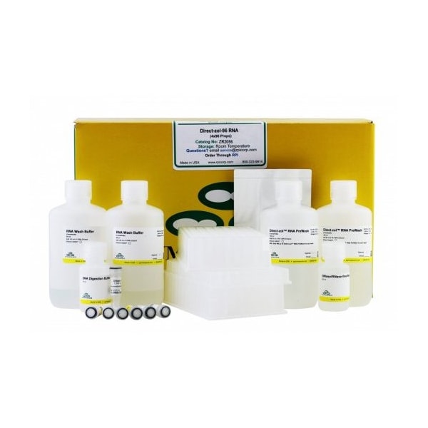 The Direct-zol-96 RNA Kits are RNA purification kits that provide a streamlined method for the purification of up to 10 μg (per well) of high-quality RNA directly from samples in TRI Reagent. Total RNA, including small RNAs (17-200 nt), is effectively isolated from a variety of sample sources (cells, tissues, serum, plasma, blood, biological liquids, etc.) using this product. The extraction method inactivates viruses and other infectious agents. The procedure is easy: simply apply a sample in TRI Reagent to the Zymo-Spin I-96 Plate, then bind, wash, and elute the RNA. No phase separation, precipitation, or post-purification steps are necessary. The result is broad range purification of small and large RNAs suitable for subsequent RNA-based methods including RT-PCR, transcription profiling, hybridization, etc. The entire procedure typically takes about 30 minutes (per 2 plates).Easy Handling: Bypass chloroform, phase separation and precipitation steps. NGS-Ready: Ultra-pure RNA without phenol carryover. No DNA contamination (DNase I included). Non-Biased: Complete RNA recovery without miRNA loss.