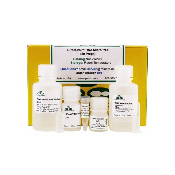 The Direct-zol RNA MicroPrep Kits are RNA purification kits that provide a streamlined method for the purification of up to 10 μg (per prep) of high-quality RNA directly from samples in TRI Reagent or similar. Total RNA, including small RNAs (17-200 nt), is effectively isolated from a variety of sample sources (cells, tissues, serum, plasma, blood, biological liquids, etc.). Isolation of RNA by conventional phase separation was shown to selectively enrich for some species of miRNA, leading to bias in downstream analysis. The Direct-zol method assures unbiased recovery of small RNAs including miRNA. The procedure is easy. Simply apply a prepared sample in TRI Reagent directly to the Zymo-Spin Column and then bind, wash, and elute the RNA. No phase separation, precipitation, or post-purification steps are necessary. The eluted RNA is high quality and suitable for subsequent molecular manipulation and analysis (including RT-PCR, transcription profiling, hybridization, sequencing etc.). The entire procedure typically takes only 7 minutes.Easy Handling: Bypass chloroform, phase separation and precipitation steps. NGS-Ready: Ultra-pure RNA without phenol carryover. No DNA contamination (DNase I included). Non-Biased: Complete RNA recovery without miRNA loss.