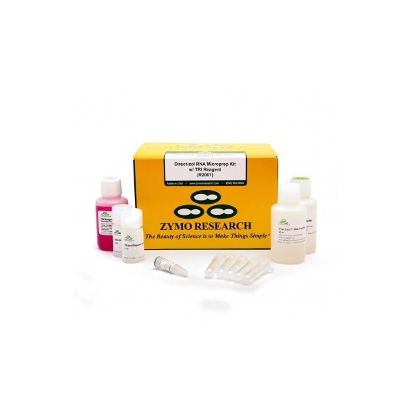 The Direct-zol RNA MicroPrep Kits are RNA purification kits that provide a streamlined method for the purification of up to 10 μg (per prep) of high-quality RNA directly from samples in TRI Reagent or similar. Total RNA, including small RNAs (17-200 nt), is effectively isolated from a variety of sample sources (cells, tissues, serum, plasma, blood, biological liquids, etc.). Isolation of RNA by conventional phase separation was shown to selectively enrich for some species of miRNA, leading to bias in downstream analysis. The Direct-zol method assures unbiased recovery of small RNAs including miRNA. The procedure is easy. Simply apply a prepared sample in TRI Reagent directly to the Zymo-Spin Column and then bind, wash, and elute the RNA. No phase separation, precipitation, or post-purification steps are necessary. The eluted RNA is high quality and suitable for subsequent molecular manipulation and analysis (including RT-PCR, transcription profiling, hybridization, sequencing etc.). The entire procedure typically takes only 7 minutes. Easy Handling: Bypass chloroform, phase separation and precipitation steps. NGS-Ready: Ultra-pure RNA without phenol carryover. No DNA contamination (DNase I included).Non-Biased: Complete RNA recovery without miRNA loss.