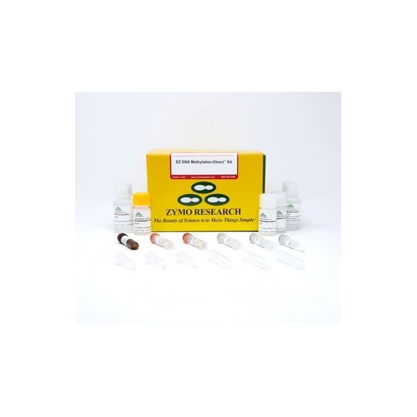 The EZ DNA Methylation-Direct kit is a bisulfite conversion kit that features reliable and complete DNA bisulfite conversion directly from blood, tissue, and cells without the prerequisite for DNA purification. The increased sensitivity of this bisulfite conversion kit makes it possible to amplify bisulfite-converted DNA from as few as 10 cells or 50 pg DNA. Recovered bisulfite-converted DNA is ideal for downstream analyses including PCR amplification, endonuclease digestion, sequencing, microarrays, etc. Complete bisulfite conversion of DNA directly from blood, soft tissue, cells, FFPE samples, and LCM samples.Compatible with small sample inputs as few as 10 cells or 50 pg of DNA. DNA recovered by this bisulfite conversion kit is ideal for downstream analyses including PCR, endonuclease digestion, sequencing, microarrays, etc.