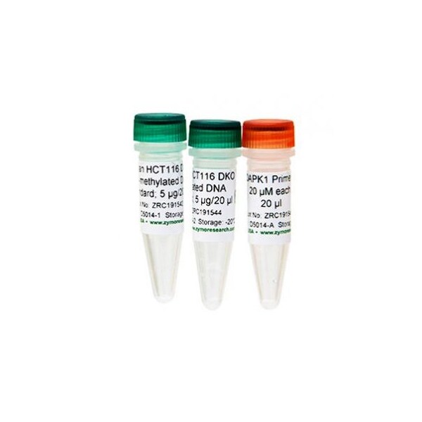 The Human Methylated & Non-methylated DNA Set consists of two DNA controls (a CpG-methylated human DNA standard and a non-methylated human DNA standard), with a set of specifically designed primers that can be used in conjunction with the EZ DNA Methylation family of products. This DNA set can be included as a positive and negative control to assess the efficiency of bisulfite conversion of DNA. The non-methylated human DNA is purified from the HCT116 DKO cell line, which contains genetic knockouts of both DNA methyltransferases DNMT1 (-/-) and DNMT3b (-/-). The methylated DNA standard is purified HCT116 DKO DNA that has been enzymatically methylated at CpG sites. Purified, non-methylated and methylated human DNA for use as negative and positive controls in methylation detection applications. Standards can be assayed in parallel with samples to monitor bisulfite conversion efficiency.Ideal controls for bisulfite sequencing PCR (BSP) and methylation specific PCR (MSP). Each standard is provided with a primer set to amplify a fragment of DNA after bisulfite conversion