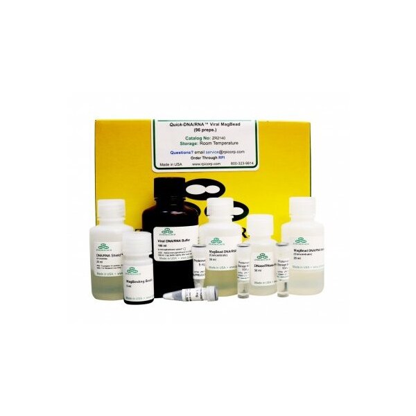 Quick-DNA/RNA Viral MagBead kit is a viral DNA/RNA purification kit designed for high-throughput purification of viral DNA and/or RNA from plasma, serum, urine, cell culture media, blood, saliva, cellular suspensions, biopsies and swab and fecal samples stored in DNA/RNA Shield. The kit also features a buffer system that facilitates complete viral particle lysis for efficient nucleic acid isolation. Small (>50 nt) and large (>200 kb) DNA and RNA are bound to magnetic beads, washed and eluted. The isolated high-quality nucleic acids are ready for all downstream applications such as Next-Gen sequencing, hybridization-based and RT/PCR detection. High-throughput, magnetic-bead based purification of viral DNA and RNA from plasma, serum, urine, cell culture media, blood, saliva, cellular suspensions, biopsies and swab and fecal samples stored in DNA/RNA Shield. High-quality viral DNA/RNA is ready for Next-Gen sequencing, RT-qPCR, hybridization, etc.