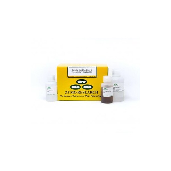 The Select-a-Size DNA MagBead Kit provides the fastest and easiest method to purify specific ranges of DNA fragments from PCR, endonuclease digestions, ligations, library preparations, adapter removal, etc. This simple workflow allows for specific cutoffs that can be modified to suit reaction clean-up, left-sided, right-sided or even double-sided size selection. The Select-a-Size MagBeads selectively binds fragments based on the volume of buffer added relative to the sample. Simply choose a desired cutoff to bind the target of interest onto the beads and remove species outside of this range. The desired DNA is easily eluted from the beads following a rapid wash regimen.Choose from one of the pre-determined cutoffs or fine tune the protocol for even more specific selections between these points. Size selections can be performed in as little as 10 minutes to yield high-quality DNA which is suitable for highly sensitive applications including Next Generation Sequencing, and any other sensitive downstream applications. The protocol can be performed manually or using an automated platform for high throughput processing. Quick 10 minute protocol for size selection can be tuned from 100 bp to 1000 bp. Clean and concentrate DNA from enzymatic reactions and library preparations down to an elution volume of 10 Î1⁄4l. Easily adaptable for clean-up, left sided size selection, right sided size selection, or double size selection. Eluted DNA is well suited for use in next generation sequencing, PCR, DNA ligation, endonuclease digestion, etc.