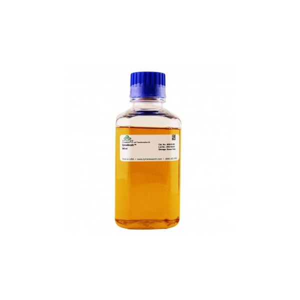ZymoBroth (ZB) is a specially formulated growth medium used for the preparation of highly competent E. coli cells for DNA transformation. When compared to classic SOB growth medium, ZymoBroth dramatically increases transformation efficiency, typically on the order of 5 - 100 fold (depending on the E. coli strain). As part of our popular Mix & Go! E. coli Transformation Kit, ZB enables researchers to generate their own homemade Mix & Go! E. coli for DNA transformation. ZB medium has been tested on a wide range of E. coli strains. Our data indicate that ZB medium stimulates the transformation efficiency of all E. coli strains tested, including K12 derivatives (such as JM109, HB101, etc.) and B strain derivatives (such as BL21, etc.). Prepare Highly Competent E. coli: Increase transformation efficiency up to 100 fold. Improves Most E. coli Strains: ZymoBroth stimulates the transformation efficiency of a wide range of strains, including K12 derivatives (JM109, HB101, etc.) and B strain derivatives (BL21, etc.)Better Results: Ideal growth medium for generating competent cells with difficult-to-transform E. coli strains.